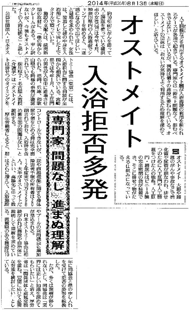 また、温泉センター等の場合は、オストメイトお断りというところもまれにあるようですのでお互い不愉快な思いをしないように注意してください。